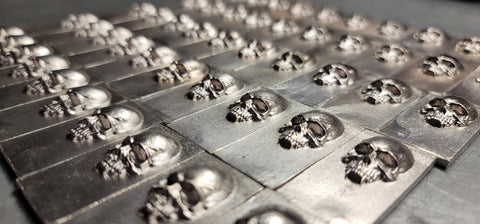 This piece is designed to feel like a treasure you shouldn’t have, like something pried from a tomb, meant to stay buried. The skull protrudes from the upper portion of the bar, catching light along its brow and teeth while the body of the bar broods beneath it. It’s the kind of silver that doesn’t just sit in a stack; it watches over it.