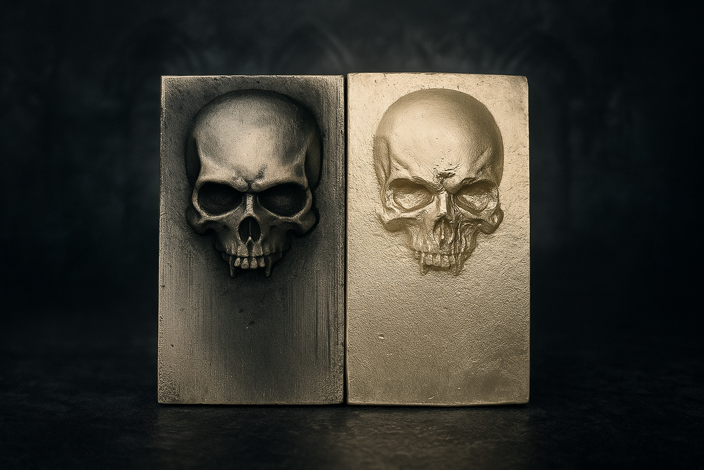 Forged in .999 fine silver, the 2025 Kannibal Skull bar is not just bullion, it’s a relic. A vertical ingot crowned by a protruding skull, it feels less like a “piece of silver” and more like something exhumed from a crypt and pressed into your hand with a warning not to let it go.